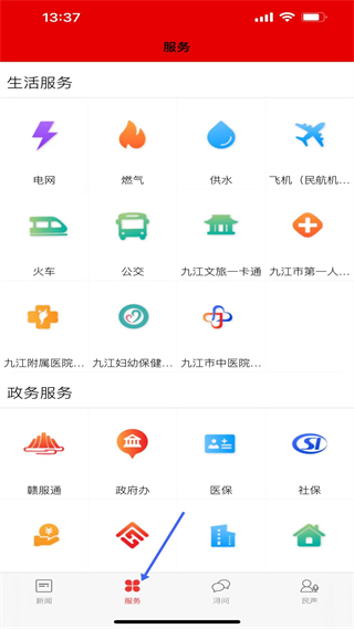2、服務板塊分生活服務和政務服務,生活服務有電網、燃氣、供水等,政務服務有贛服通、醫保、社保等,覆蓋民生與政務服務領域。