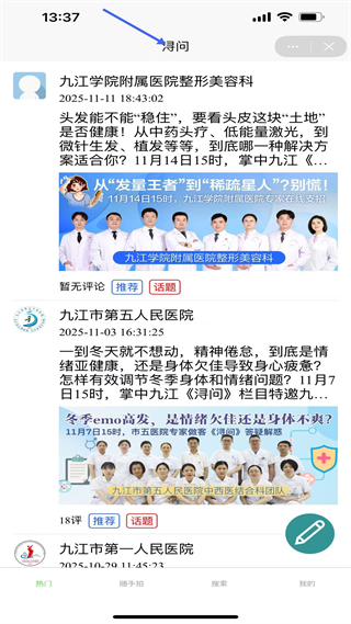 3、潯問板塊展示九江學院附屬醫院、市第五人民醫院等醫療專家在線支招資訊,提供健康問題咨詢與解答渠道。