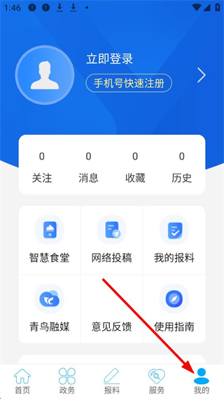 2、點擊底部我的按鈕,進入個人界面,可看到立即登錄、手機號快速注冊入口,還有關注、消息等數據統計,以及智慧食堂、網絡投稿等功能選項。