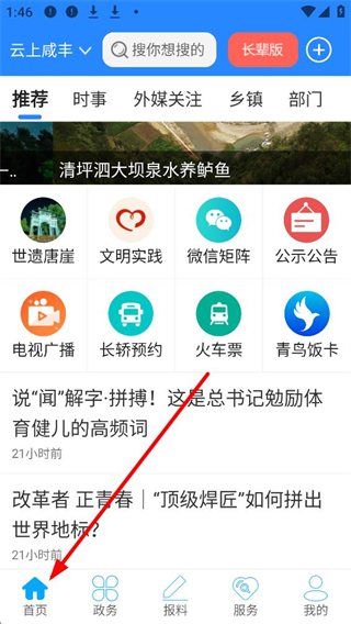 1、進入APP首先看到首頁,展示推薦、時事等板塊,還有世遺唐崖、文明實踐等功能入口,可瀏覽各類新聞資訊和使用特色功能。