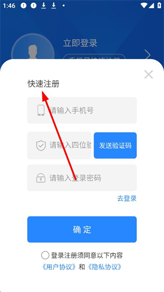 4、若選擇注冊,進入快速注冊界面,輸入手機號獲取驗證碼,設置登錄密碼,完成注冊流程,注冊前需勾選同意用戶協議和隱私協議。