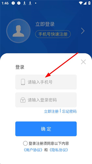 3、登錄界面,可輸入手機號和登錄密碼進行登錄,也可選擇立即注冊或忘記密碼,登錄前需勾選同意用戶協議和隱私協議。