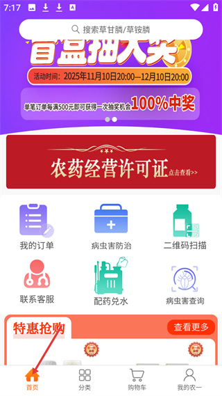 1、首頁有搜索欄可搜草甘膦等農資,展示百盤抽大獎活動,還有我的訂單等功能入口及特惠搶購板塊。