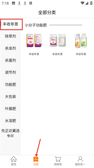 2、分類頁豐收年景分類展示其品牌農資,左側有除草劑、殺蟲劑等分類,方便用戶按農資類型篩選。