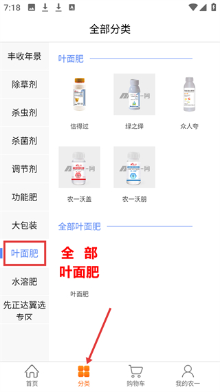 3、分類頁葉面肥分類展示信得過、綠之繹等品牌葉面肥,左側有豐收年景等分類,可進一步選擇全部葉面肥。