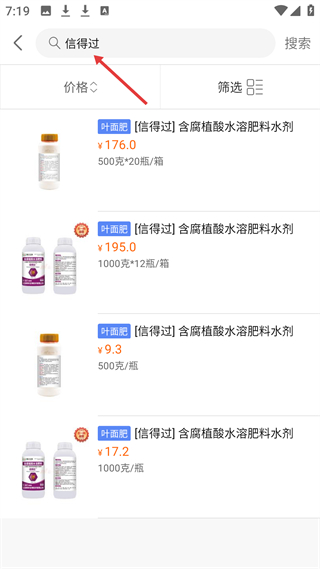 4、搜索結果頁信得過展示多款含腐植酸水溶肥料水劑,標注價格和規格,可按價格排序或篩選,方便用戶選購。