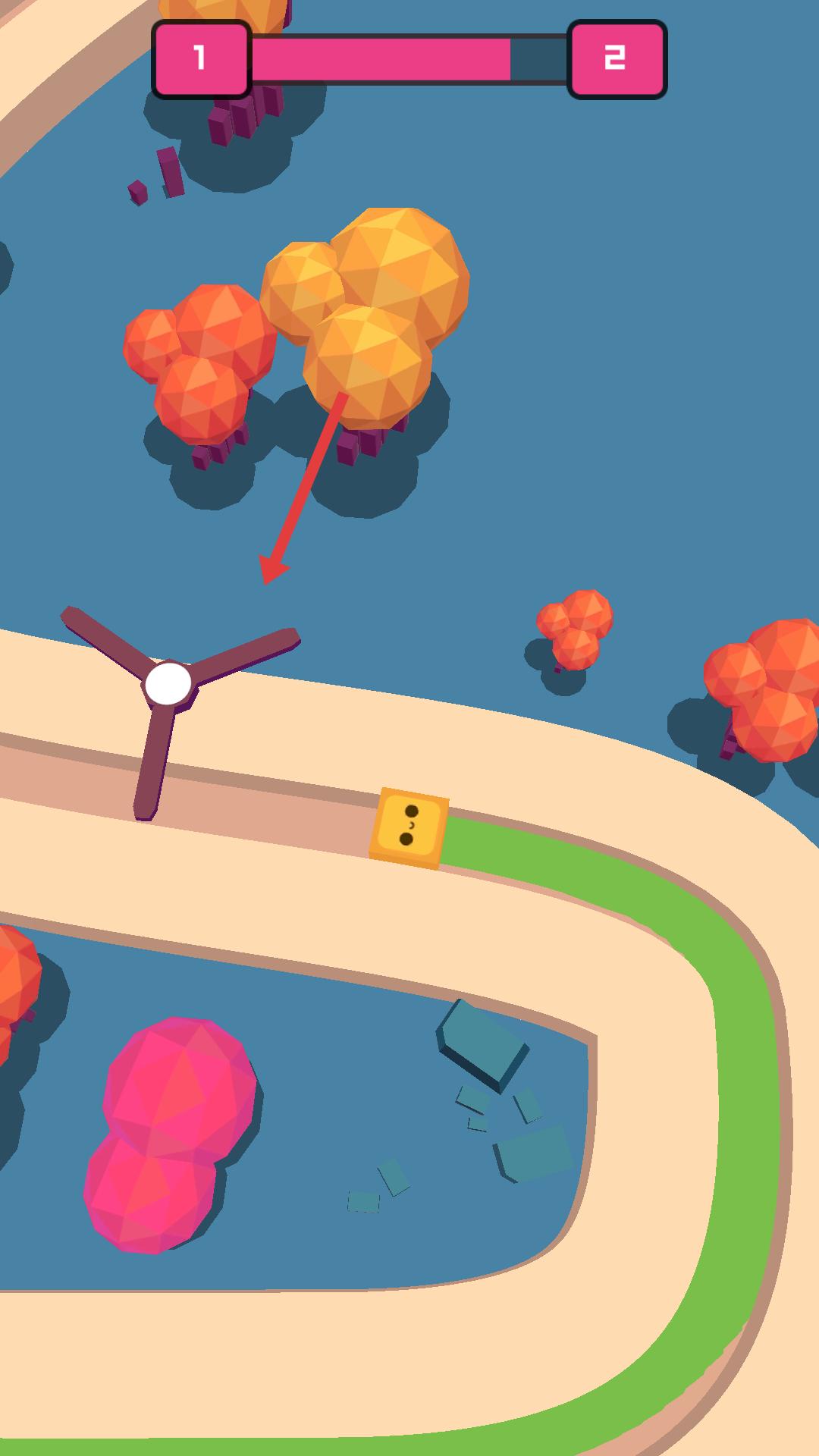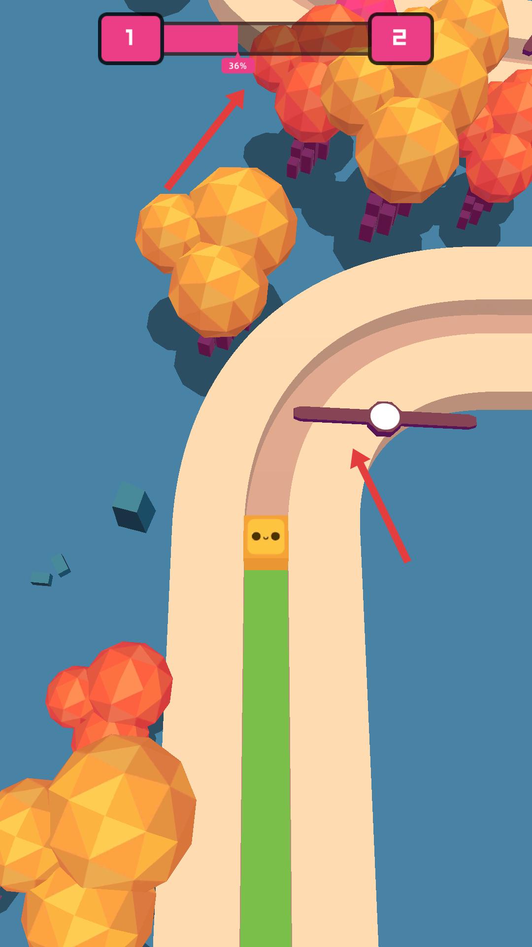 2、進入關卡后方塊在彎曲軌道上移動,上方有進度條顯示關卡進度,遇到如旋轉桿等障礙物時,要把握時機,讓方塊順利通過,推進關卡。