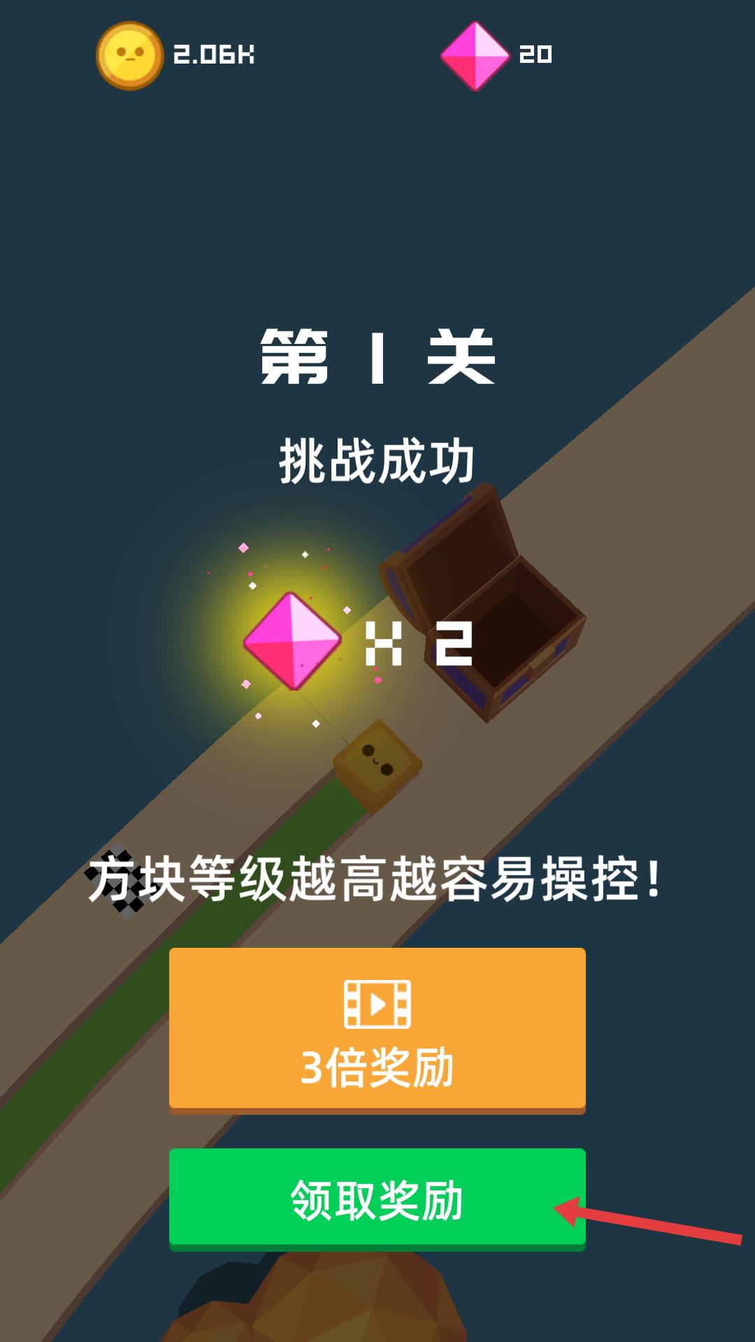 4、成功通關第一關會顯示挑戰成功,可獲得鉆石等獎勵,點擊綠色領取獎勵按鈕,獲取獎勵,這些獎勵可用于提升方塊等,助力后續關卡。