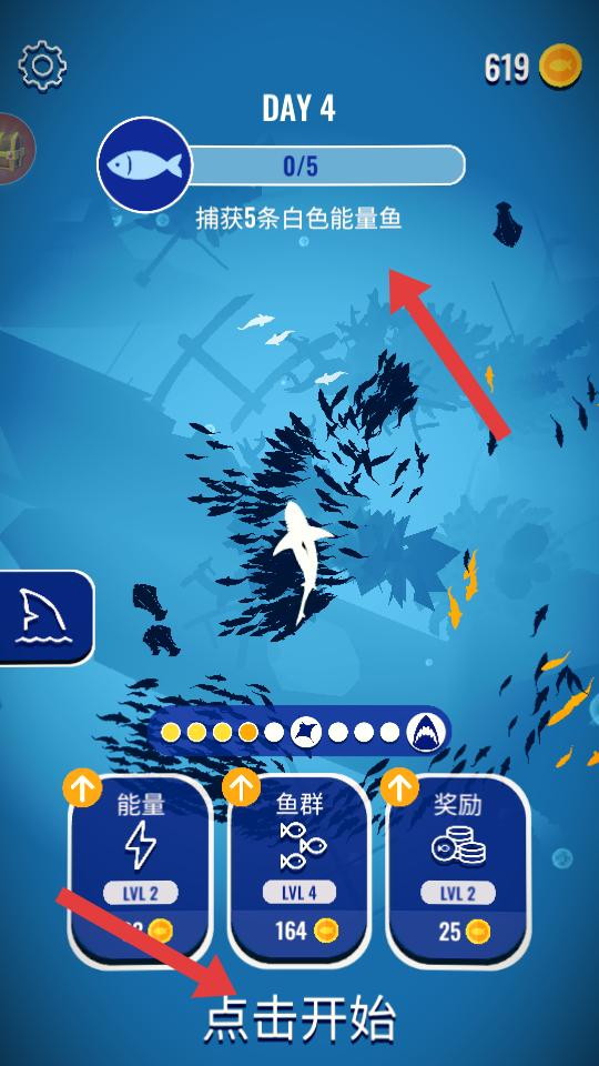 1、進入游戲會看到當天任務,如捕獲一定數量的白色能量魚,界面還有能量,魚群,獎勵等升級選項,點擊開始即可進入捕魚環節。