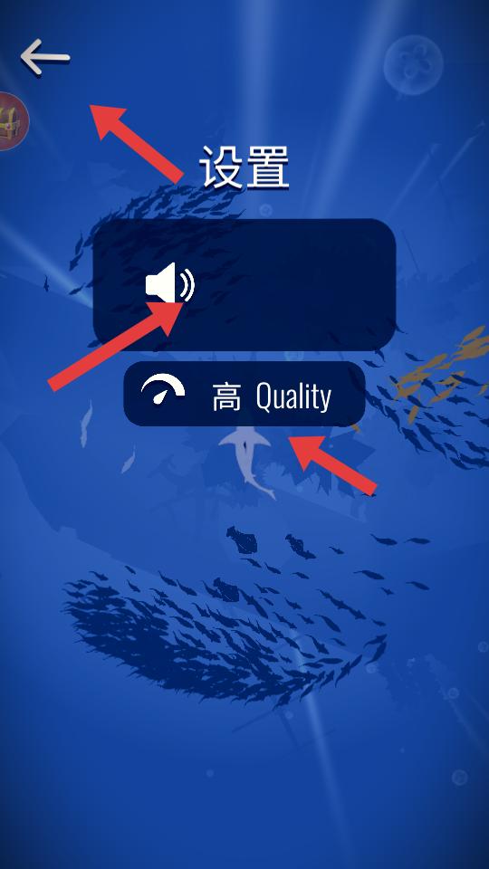 2、在設置界面,可調整音量,還能選擇畫面質量,設置完成后,點擊左上角返回箭頭,回到游戲主界面繼續捕魚。