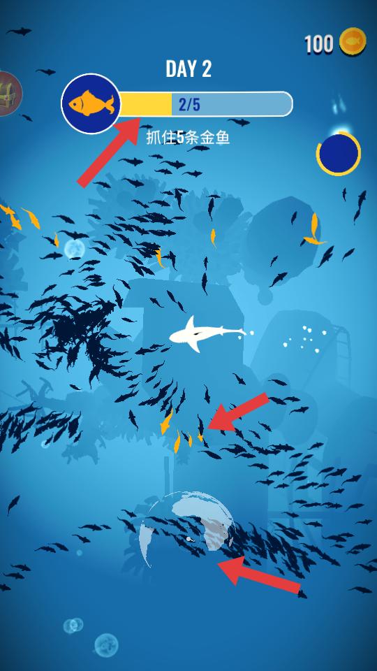 3、游戲中操控鯊魚在魚群里移動,目標是抓住指定數量的金魚,上方進度條會顯示已抓住的數量,隨著操作逐步完成任務。