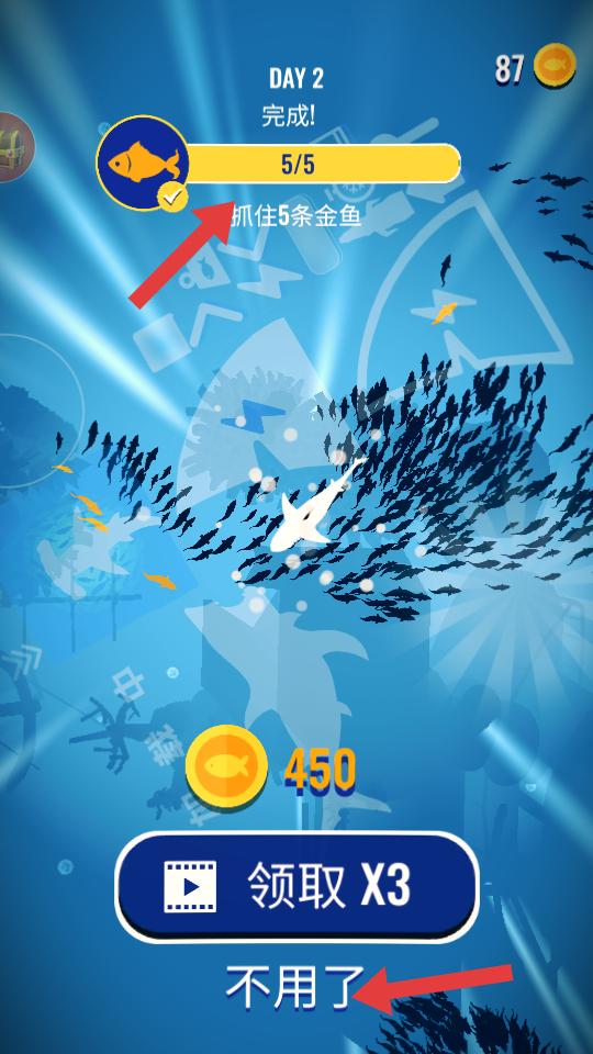 4、當成功抓住足夠數量的魚后,會顯示任務完成,此時可選擇領取三倍獎勵或者直接點擊不用了,結束該輪捕魚并獲取相應獎勵。