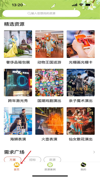 1、首頁板塊有搜索欄,展示奢侈品箱包展等精選資源,還有需求廣場,提供方案等分類入口,提供活動資源與需求對接服務。