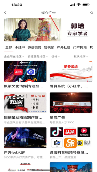 2、媒介廣告板塊有小紅書等分類,展示楓策文化傳媒等媒介資源,可按企業地區等篩選,方便用戶查找媒介廣告資源。