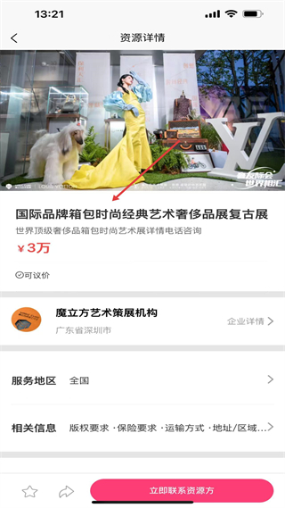 3、資源詳情箱包展板塊展示國際品牌箱包展,價格3萬可議價,顯示資源方及服務地區,用戶可立即聯系資源方。