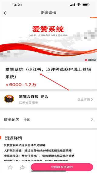 4、資源詳情愛贊系統板塊展示愛贊系統,價格6000-1.2萬,顯示資源方及服務地區,用戶可立即聯系資源方。