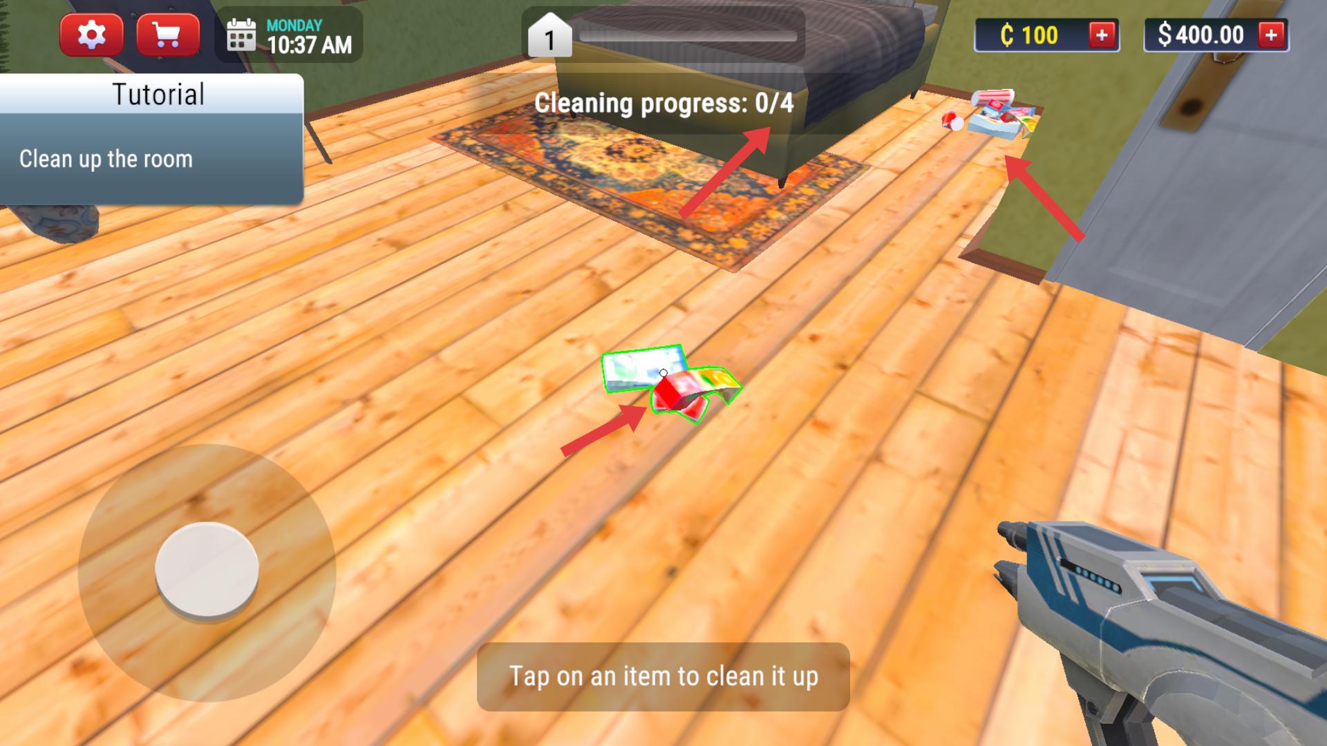2、進入房間后,開始清理房間,按照提示點擊地上的物品進行清潔,注意清潔進度,需完成4個物品的清潔,逐步讓房間變得整潔。