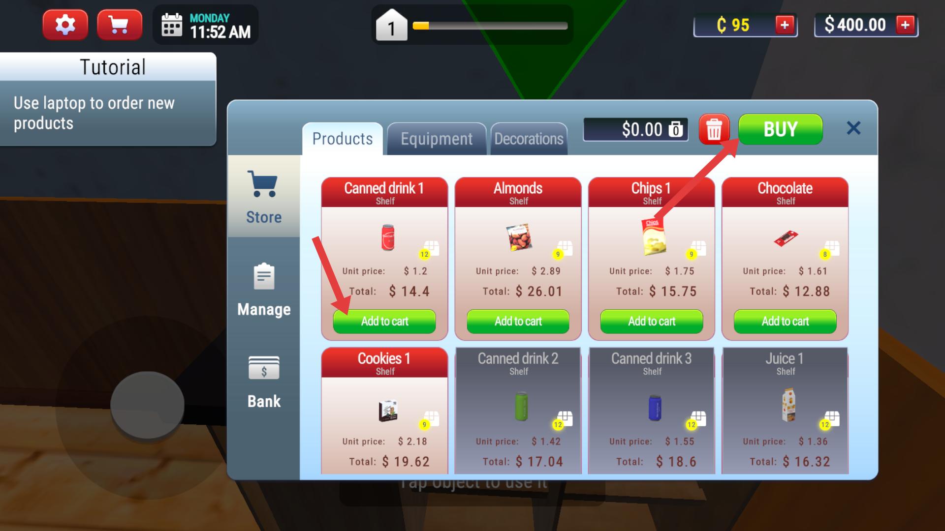 4、使用筆記本電腦訂購新產品,在商店界面選擇需要的商品,點擊Add to cart加入購物車,然后點擊BUY完成購買,補充酒店物資。