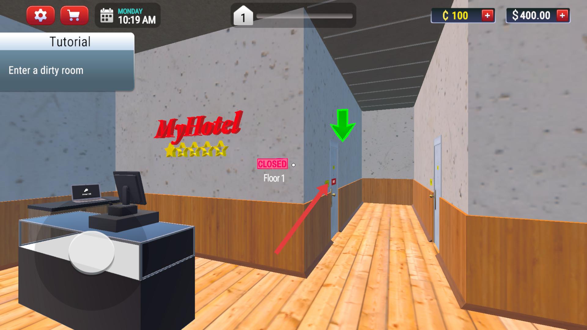 1、根據提示進入臟房間,在酒店大廳找到標有提示的房間門,進入后可開啟后續清潔等任務,這是新手教程的第一步,熟悉酒店環境。