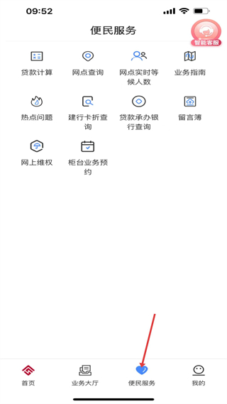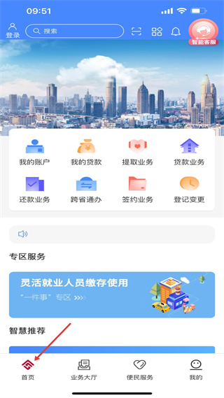 2、首頁,展示賬戶貸款等核心業務入口,設專區服務與智慧推薦板塊,是業務辦理的核心操作頁。