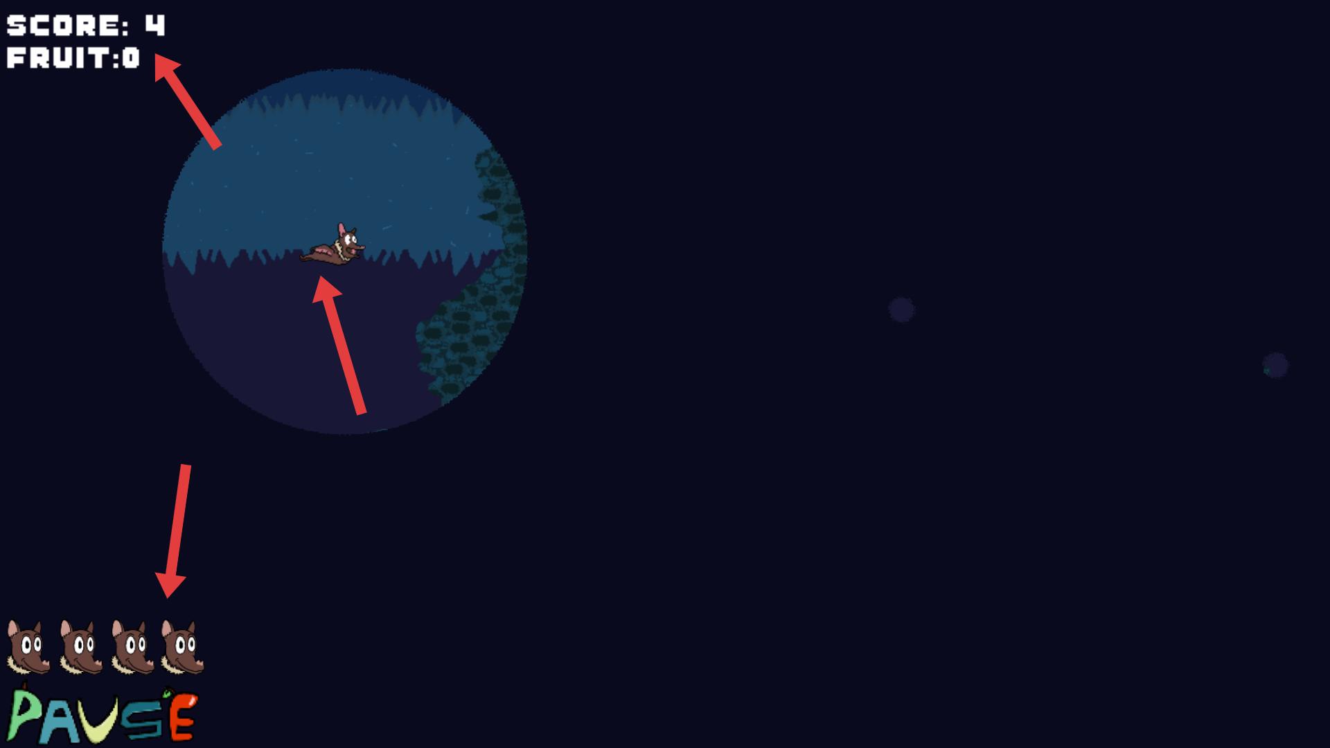 2、進入游戲看到果蝠在場景中飛行,左上角顯示分數和收集水果數,下方有果蝠頭像,代表剩余生命數,操控果蝠躲避危險,持續飛行,積累分數。