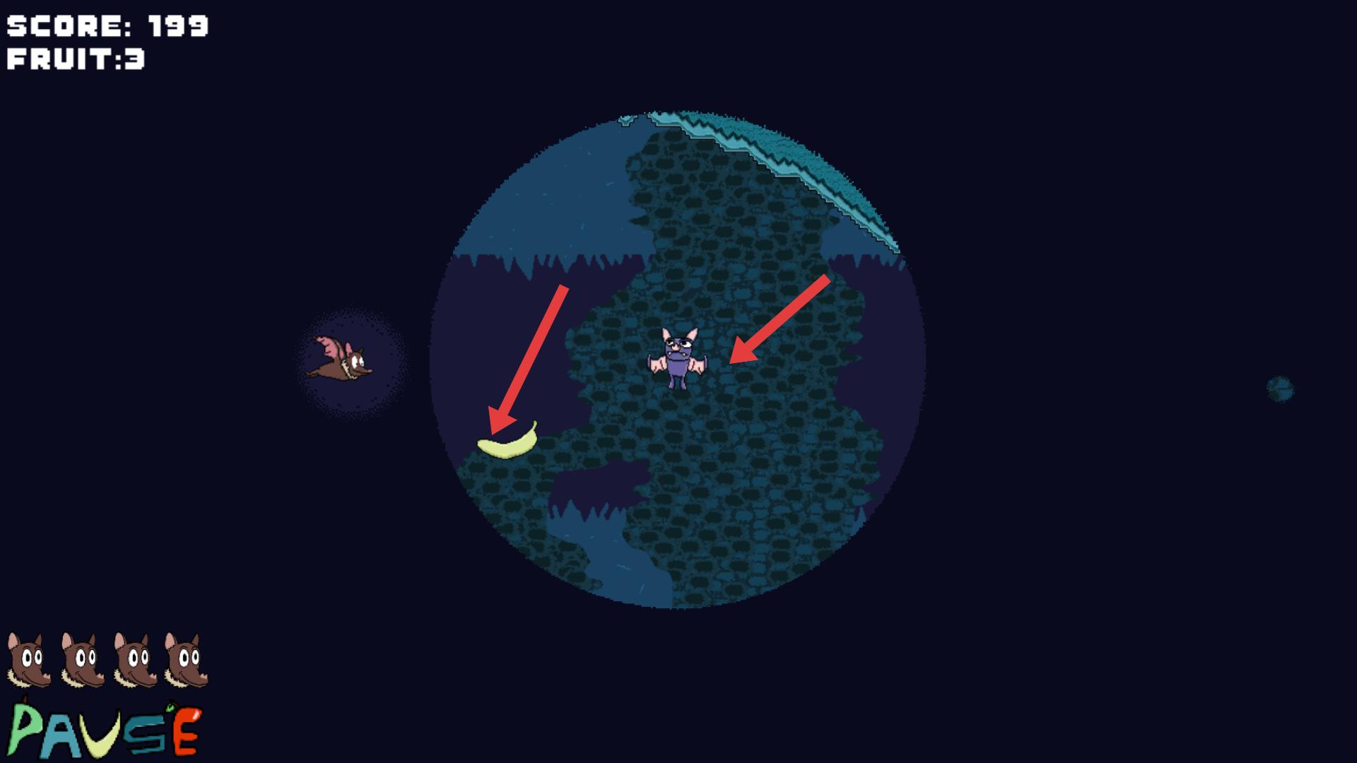 4、繼續飛行會遇到紫色果蝠等元素,同時還有香蕉等水果可收集,操控果蝠靈活移動,收集更多水果,提升分數,同時應對可能出現的挑戰,推進游戲。