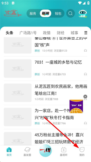 1、進入應用先看到首頁新聞板塊,包含頭條、廣場路1號等資訊分類,可瀏覽各類原創內容,底部設有首頁、嘉友圈等功能入口切換板塊。