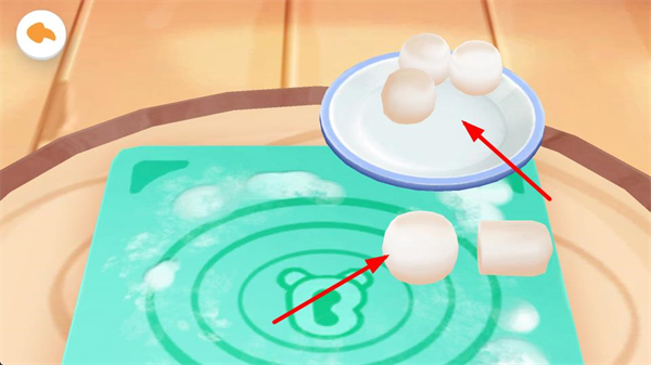3、將分好的材料段揉成圓球狀,再把部分圓球放入容器里,逐步完成材料的基礎塑形步驟,推進甜品制作進度。
