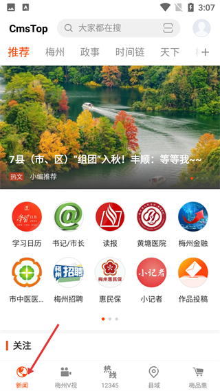 1、新聞板塊,有推薦、梅州等分類,設學習日歷等功能入口,展示7縣入秋熱文,用戶可獲取本地及天下新聞資訊。