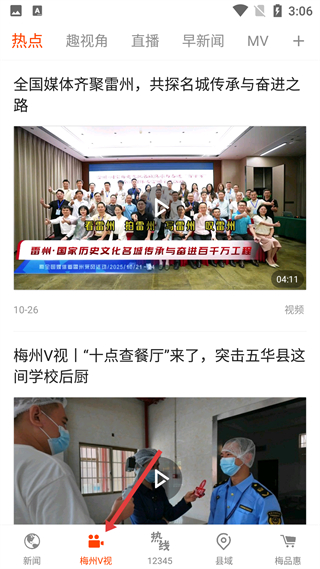 2、梅州V視板塊,含熱點、趣視角等分類,有雷州媒體聚集、學校后廚檢查視頻,用戶可觀看本地新聞視頻。