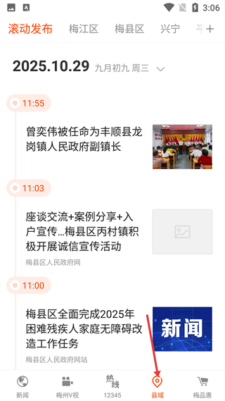 4、縣域板塊,有滾動發布等分類,展示豐順人事任命、梅縣誠信宣傳資訊,用戶可了解梅州縣域本地動態。