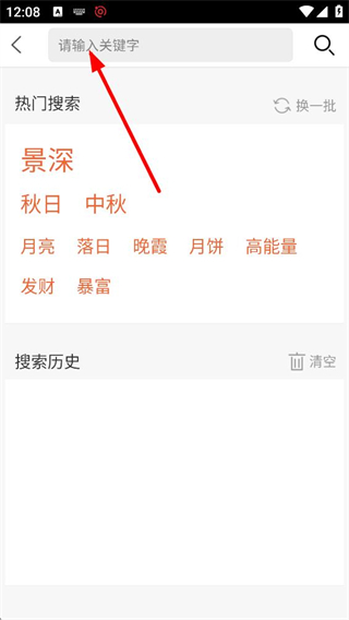 3、進入搜索頁面,除關鍵字輸入框外,下方展示著熱門搜索詞條如景深秋日等,還有搜索歷史板塊,同時可點擊換一批更新熱門搜索的內容。
