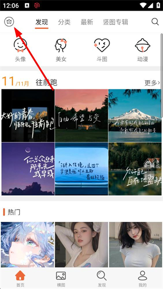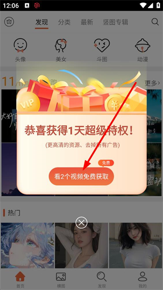 1、進入安卓壁紙的發現頁面,能看到頭像美女等分類及往前跑主題內容,點擊左上角按鈕,彈出恭喜獲得1天超級特權的提示彈窗,該特權可解鎖更高清資源及去除廣告。