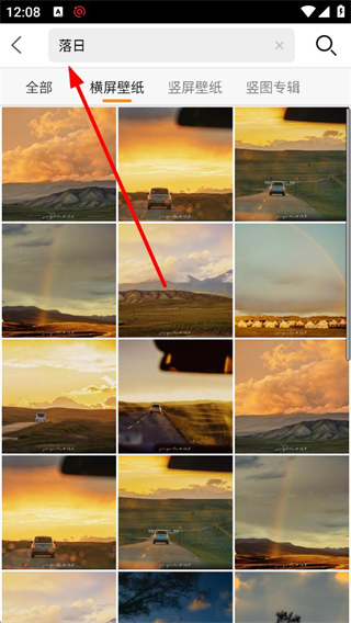 4、搜索框輸入落日并執行搜索,進入對應的結果頁面,頂部有全部橫屏壁紙等分類標簽,選擇橫屏壁紙分類,即可瀏覽對應的落日主題橫屏壁紙。