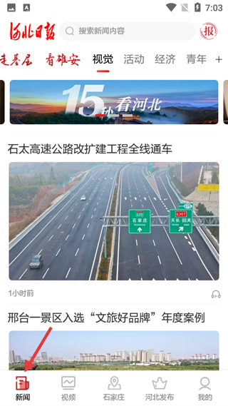 1、新聞板塊有走基層、看雄安等頻道,展示石太高速公路改擴建通車、邢臺景區入選文旅案例等資訊,支持新聞內容搜索。