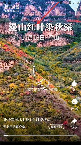 2、視頻板塊,呈現平山漫山紅葉的視頻內容,支持上滑查看下一個視頻,可點贊、評論、分享,還有查看詳情功能。