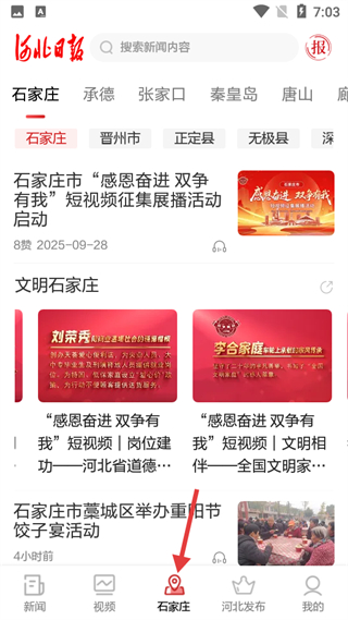 3、石家莊板塊,分石家莊、承德等地區,展示石家莊市短視頻征集活動、文明石家莊案例、藁城區重陽節活動等本地資訊。