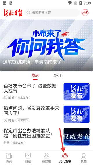 4、河北發布板塊,有熱點、矩陣分類,展示首場發布會數據、省發改委回應熱點問題、保定市剛性支出困難家庭認定辦法等政務資訊。