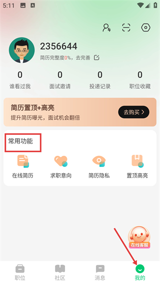 2、個人中心展示賬號信息與簡歷完整度,有求職數據入口,常用功能區含在線簡歷、求職意向等核心操作入口。