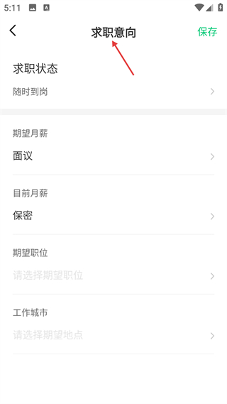 4、求職意向設置頁可配置求職狀態、期望薪資等信息,每項均可選擇輸入,設置后點擊保存,助力匹配崗位需求。