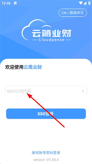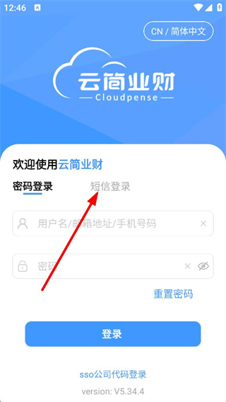 1、進入云簡業財登錄界面,有密碼登錄和短信登錄選項,密碼登錄需輸入用戶名郵箱地址或手機號碼及密碼,也可選擇重置密碼,同時支持sso公司代碼登錄。