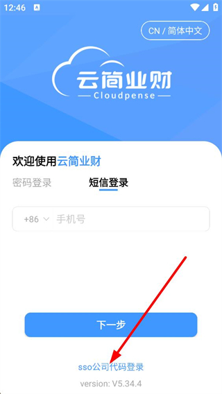 2、切換至短信登錄頁面,需選擇地區碼并輸入手機號,點擊下一步即可繼續操作,也可選擇sso公司代碼登錄的方式。