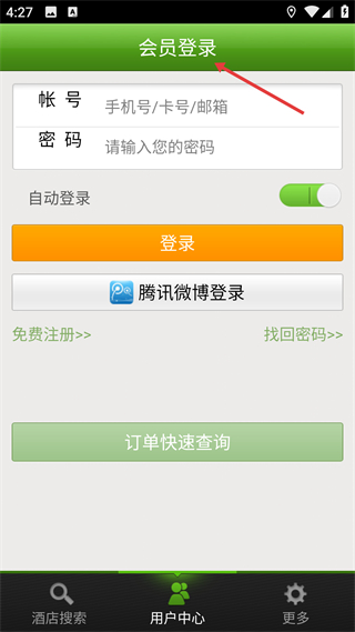 2、進入會員登錄界面,在賬號欄填手機號卡號或郵箱,密碼欄輸入密碼,也可選騰訊微博登錄,點擊登錄按鈕進入賬號。