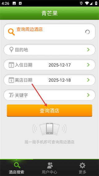4、進入酒店查詢界面,選擇目的地入住離店日期關鍵詞,點擊查詢酒店按鈕,也可搖手機查詢周邊酒店信息。