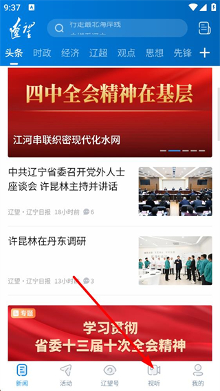 1、進入應用首頁,可看到頭條時政等分類欄與各類資訊,底部有新聞活動等按鈕,點擊視聽可進入相關專題頁面,查看會議精神類內容。