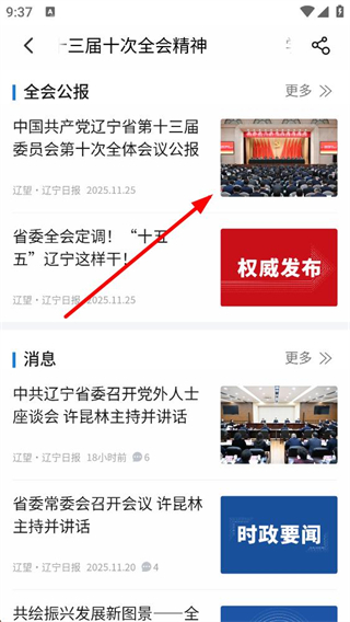 2、專題頁面能看到全會公報消息等板塊,包含省委全會相關資訊,點擊對應公報內容,可進入該會議公報的詳細閱讀界面。