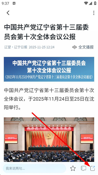 3、進入會議公報詳情頁,能查看公報發布時間、會議召開信息等內容,頁面底部有互動及分享等功能按鈕,點擊分享可打開分享選項。
