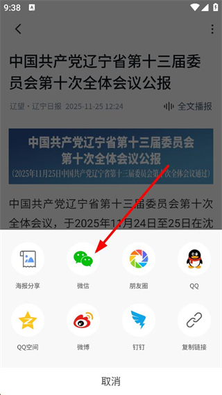 4、打開分享選項后,可看到微信朋友圈等多種分享渠道,選擇對應渠道即可將該會議公報內容分享至相應平臺,完成信息傳播操作。