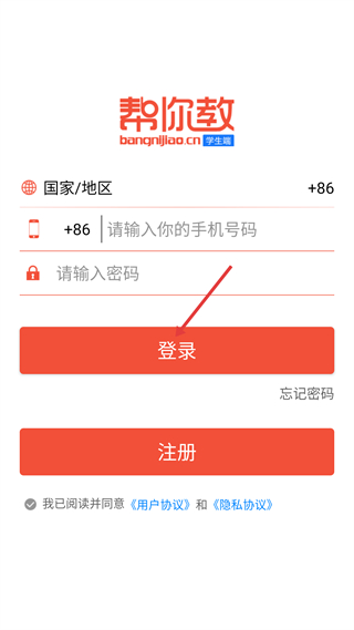 1、登錄時輸入手機號與密碼,勾選同意用戶協議和隱私協議后點登錄,未注冊選注冊,忘記密碼可走找回流程。