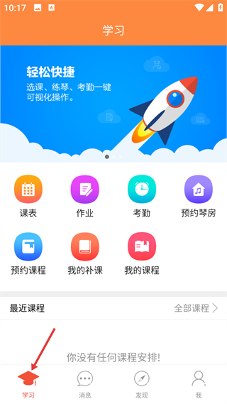 2、學習頁能查看課程安排,使用課表作業考勤等工具,還可預約琴房與課程,高效管理自身學習相關事項。